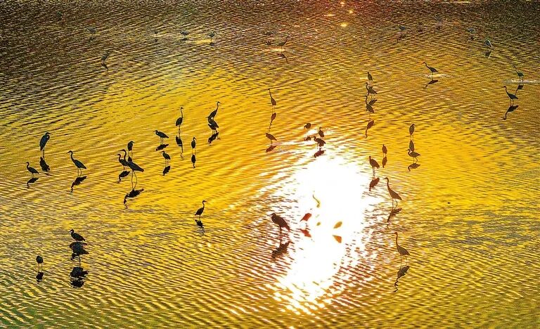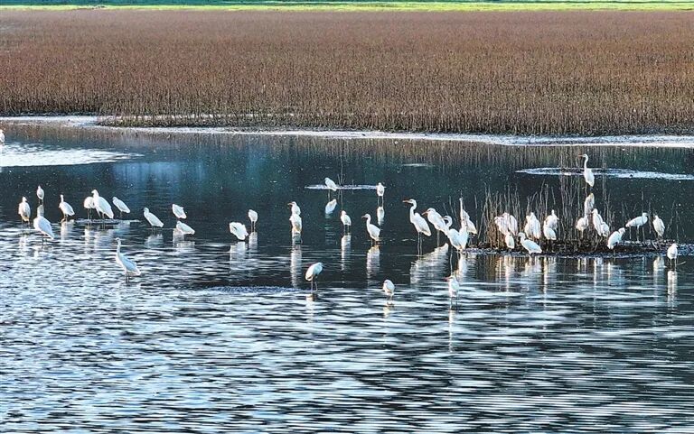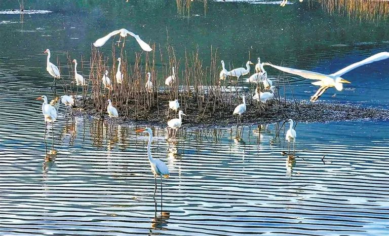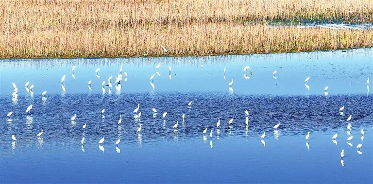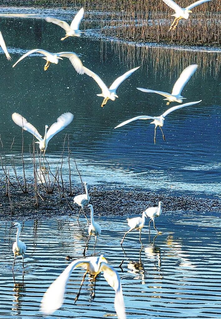白昼时分,成群白鹭或驻足浅滩觅食,或展翅翩跹,为静谧的湿地平添无限生机。